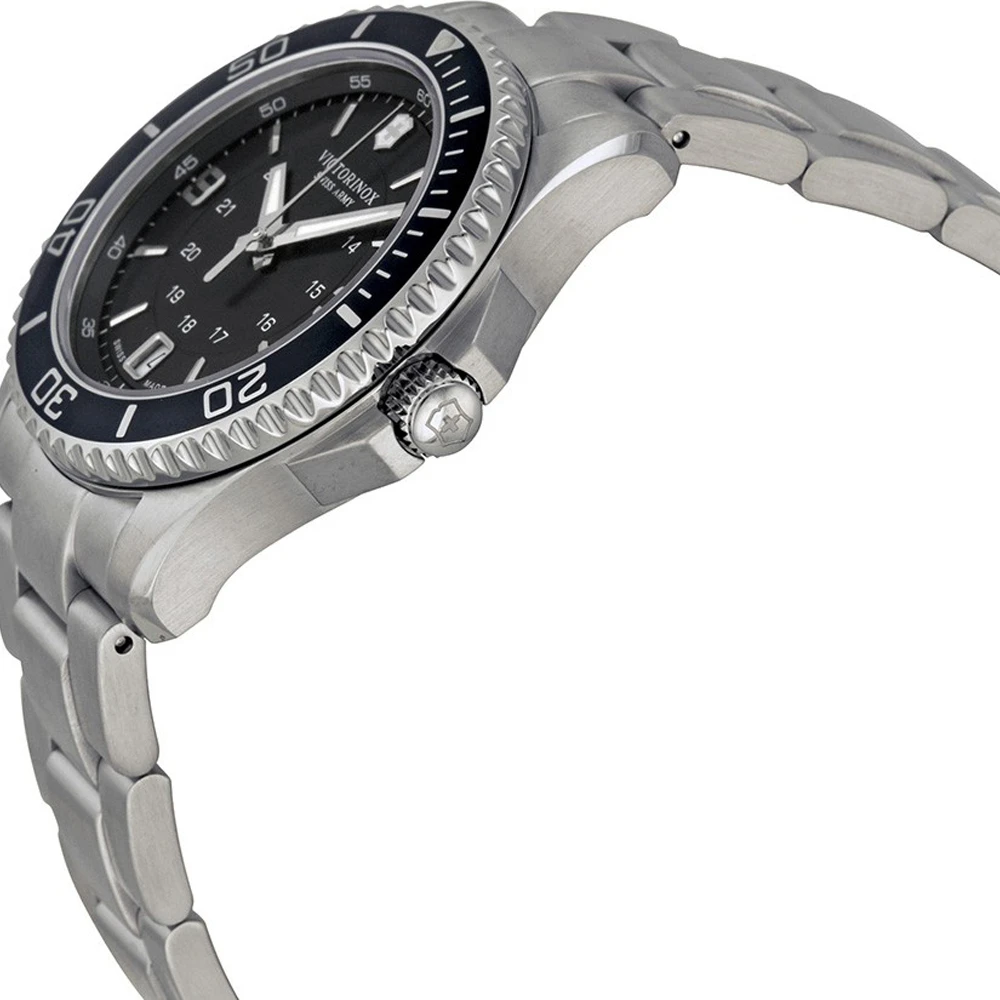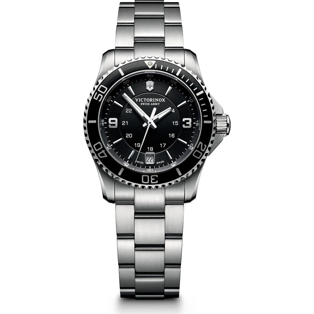 This Victorinox Swiss Army watch has a case made of stainless steel with a diameter of 34 mm and is fitted with a metal band. Inside the case lies a Ronda movement and the watch features a Sapphire crystal.